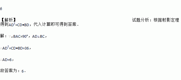 如图,在△ABC中,∠BAC=90°,AD⊥BC于D,BD=3,CD=12,则AD的长为________
