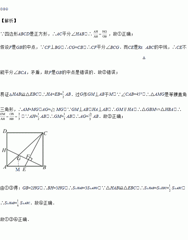 如图,E是正方形ABCD边AB的中点,连接CE,过点B作BH⊥CE于F,交AC于G,交AD于H,下列说法:①