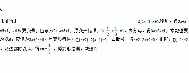 C. (x+2)-2(x-1)=0,去括号,得x+2-2x+2=0 D. -4x=2,两边都除以-4,得x=-2