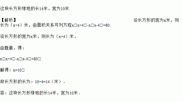 已知一块长方形绿地,在它的中央布置一个长方形花坛,四周铺上草地.设计的条件是这样的:绿地的长要比宽大4米,花坛四周的草地的宽都是2米,草地的总面积是80m2.求划出的这块长方形绿地的长和宽应当各是多少米?