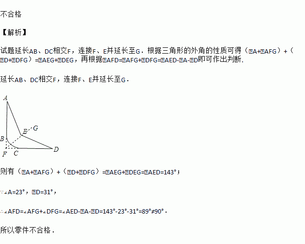 某机器零件的横截面如图所示,按要求线段AB和DC的延长线相交成直角才算合格,一工人测得∠A=23°,∠D=31°,∠AED=143°,请你帮他判断该零件是否合格:___.(填“合格”或“不合格”)
