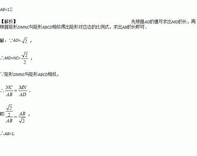 如图,把矩形ABCD对折,折痕为MN,矩形DMNC与矩形ABCD相似,已知,求AB的长.