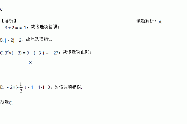 A. -3+2=1 B. |-2|=-2 C. 32×(-3)=-27 D. -2×(-)-1=1