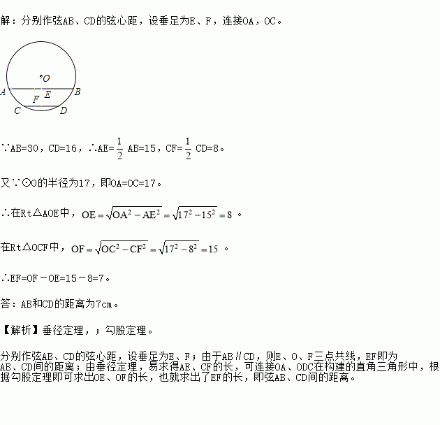 如图,⊙O的半径为17cm,弦AB∥CD,AB=30cm,CD=16cm,圆心O位于AB、CD的上方,求AB和CD间的距离.