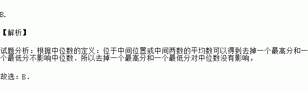 B. 【解析】 试题分析:根据中位数的定义:位于中间位置或中间两数的平均数可以得到去掉一个最高分和一个最低分不影响中位数.所以去掉一个最高分和一个最低分对中位数没有影响, 故选:B.