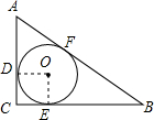 9.在Rt△ABC中,若两直角边长为6cm、8cm,则它的外接圆的面积为25πcm2,内切圆的半径为2cm.分析 先根据勾股定理求出AB的长,再由直角三角形外接圆的半径等于斜边的一半可得出外接圆的半径,进而得出其面积.连接OD,OE,由D、E为切点可知OE=OD,故四边形ODCE是正方形,由切线的性质得出BE=BF,AD=AF,根据BF+AF=BE+AD=(8-r)+(6-r)=10,由此可得出r的值.