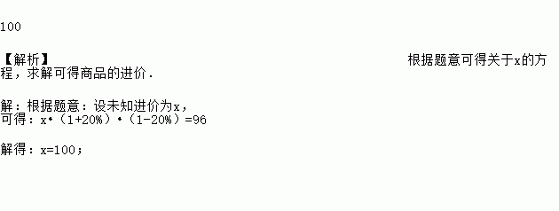 100 【解析】根据题意可得关于x的方程,求解可得商品的进价. 【解析】 根据题意:设未知进价为x, 可得:x•(1+20%)•(1-20%)=96 解得:x=100;