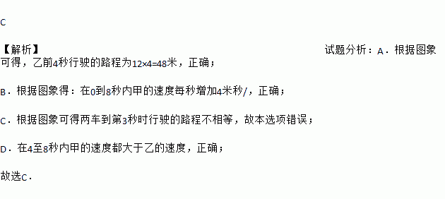C 【解析】试题分析:A.根据图象可得,乙前4秒行驶的路程为12×4=48米,正确; B.根据图象得:在0到8秒内甲的速度每秒增加4米秒/,正确; C.根据图象可得两车到第3秒时行驶的路程不相等,故本选项错误; D.在4至8秒内甲的速度都大于乙的速度,正确; 故选C.