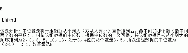 六个学生进行投篮比赛,投进的个数分别为2,3,3,5,10,13,这六个数的中位数为( )