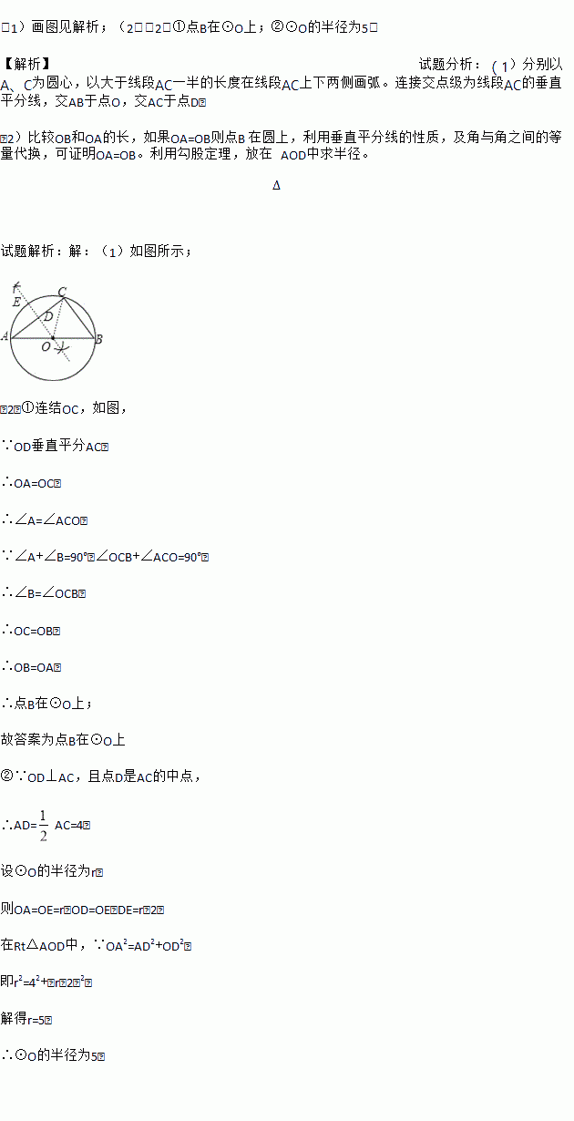 (1)画图见解析;(2)(2)①点B在⊙O上;②⊙O的半径为5. 【解析】试题分析:(1)分别以A、C为圆心,以大于线段AC一半的长度在线段AC上下两侧画弧。连接交点级为线段AC的垂直平分线,交AB于点O,交AC于点D。 (2)比较OB和OA的长,如果OA=OB则点B 在圆上,利用垂直平分线的性质,及角与角之间的等量代换,可证明OA=OB。利用勾股定理,放在∆AOD中求半径。 试...