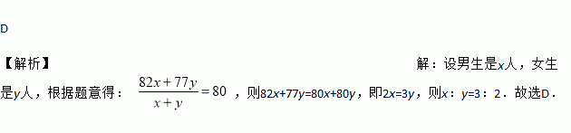 D 【解析】【解析】 设男生是x人,女生是y人,根据题意得: ,则82x+77y=80x+80y,即2x=3y,则x:y=3:2.故选D.