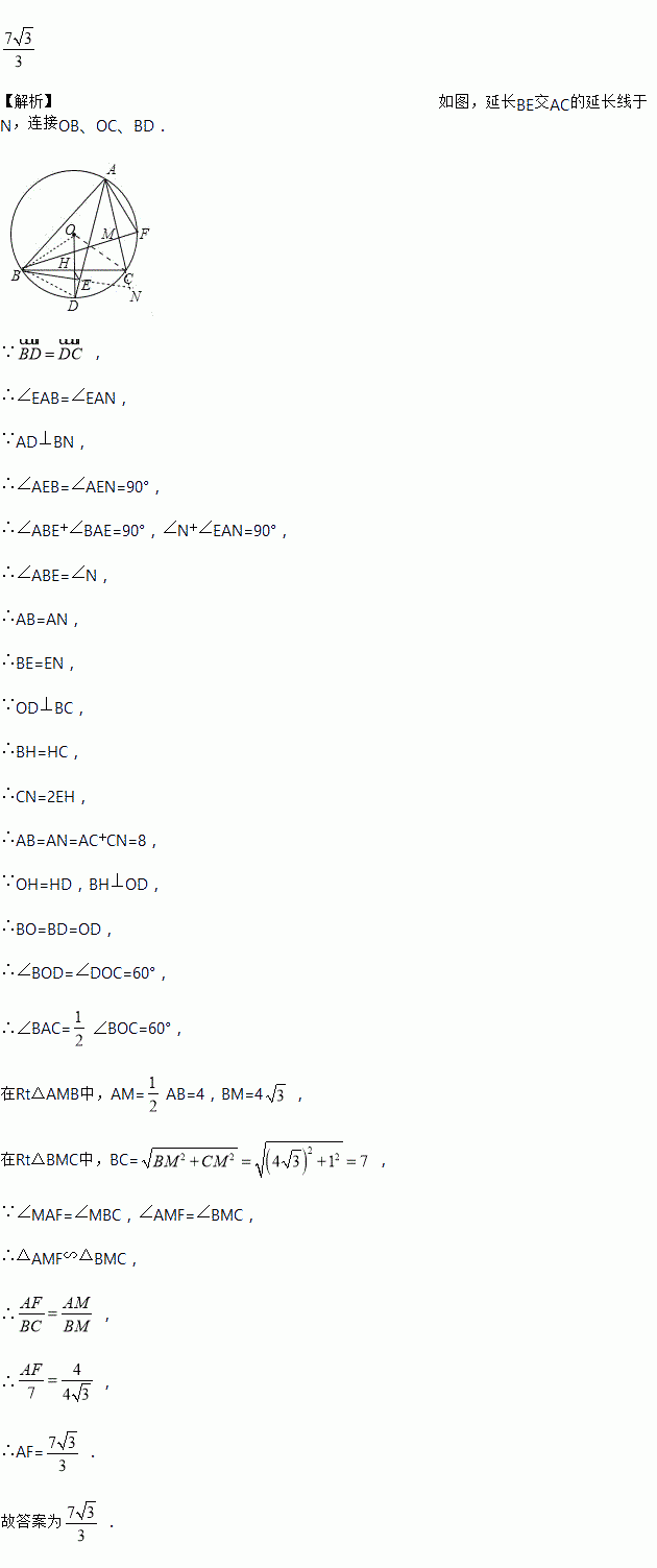 如图,△ABC内接于⊙O,D是弧BC的中点,OD交BC于点H,且OH=DH,连接AD,过点B作BE⊥AD于点E,连接EH,BF⊥AC于M,若AC=5,EH=,则AF=_____.