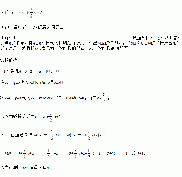 过A、B两点。(1)求这个抛物线的解析式;(2)作垂直x轴的直线x=t,在第一象限交直线AB于M,交这个抛物线于N。求当t 取何值时,MN有最大值?最大值是多少?