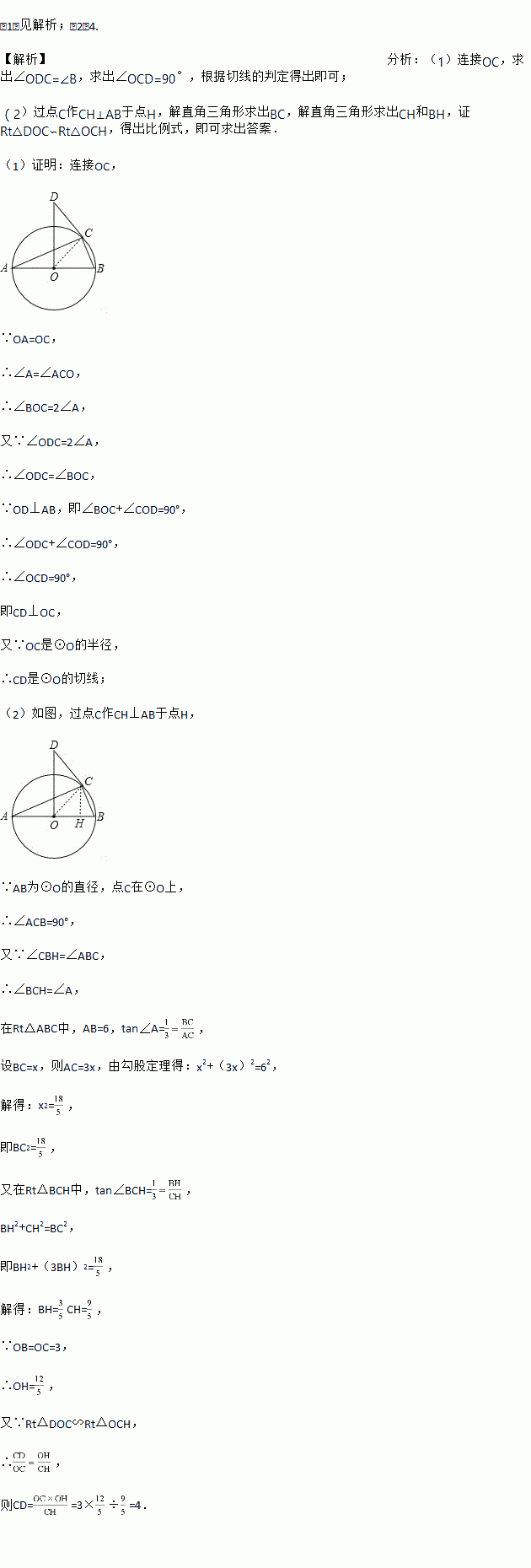 如图,已知△ABC是⊙O的内接三角形,AB为⊙O的直径,OD⊥AB于点O,且∠ODC=2∠A.