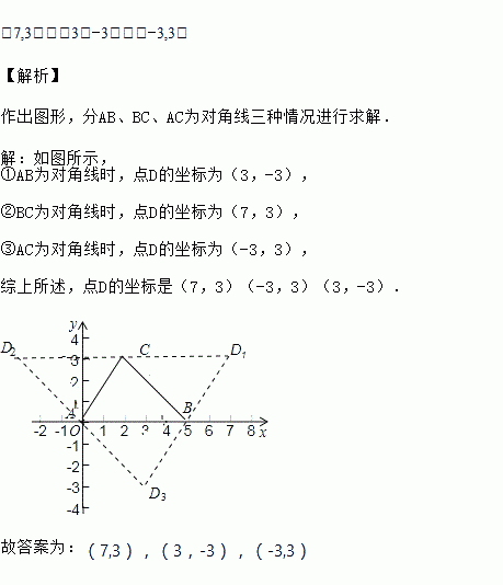 在平面直角坐标系中,点A,B,C的坐标分别是(0,0),(5,0),(2,3),以点A、B、C和点D为顶点构造平行四边形,则点D的坐标是________________.
