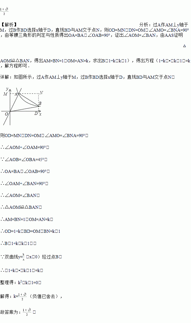 如图,在平面直角坐标系中,经过点A的双曲线y=(x>0)同时经过点B,且点A在点B的左侧,点A的横坐标为1,∠AOB=∠OBA=45°,则k的值为_____.