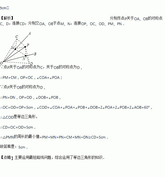 如图,点P是∠AOB内任意一点,OP=5cm,点M和点N分别是射线OA和射线OB上的动点,∠AOB=30°则△PMN周长的最小值=________