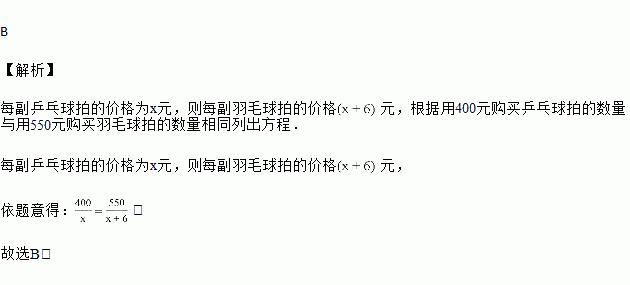 某班举行趣味项目运动会,从商场购买了一定数量的乒乓球拍和羽毛球拍作为奖品若每副羽毛球拍的价格比乒乓球拍的价格贵6元,且用400元购买乒乓球拍的数量与用550元购买羽毛球拍的数量相同![]()