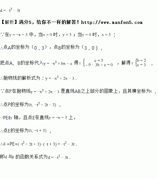 经过点A和点B,与x轴的另一个交点为点C.点P为抛物线上直线AB上方部分上的一点,过点P 作y轴的平行线交AB于点E,且点P的横坐标为t,若PE的长为d,求d关于t的函数关系式是_______.