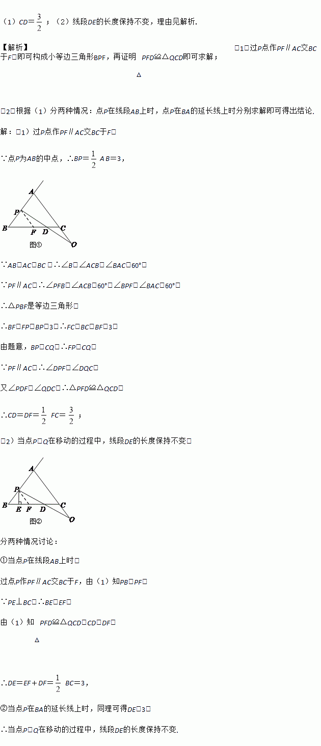 (2)如图②,过点P作直线BC的垂线,垂足为E,当点P,Q分别在射线BA和AC的延长线上任意地移动过程中,线段BE,DE,CD中是否存在长度保持不变的线段?请说明理由.