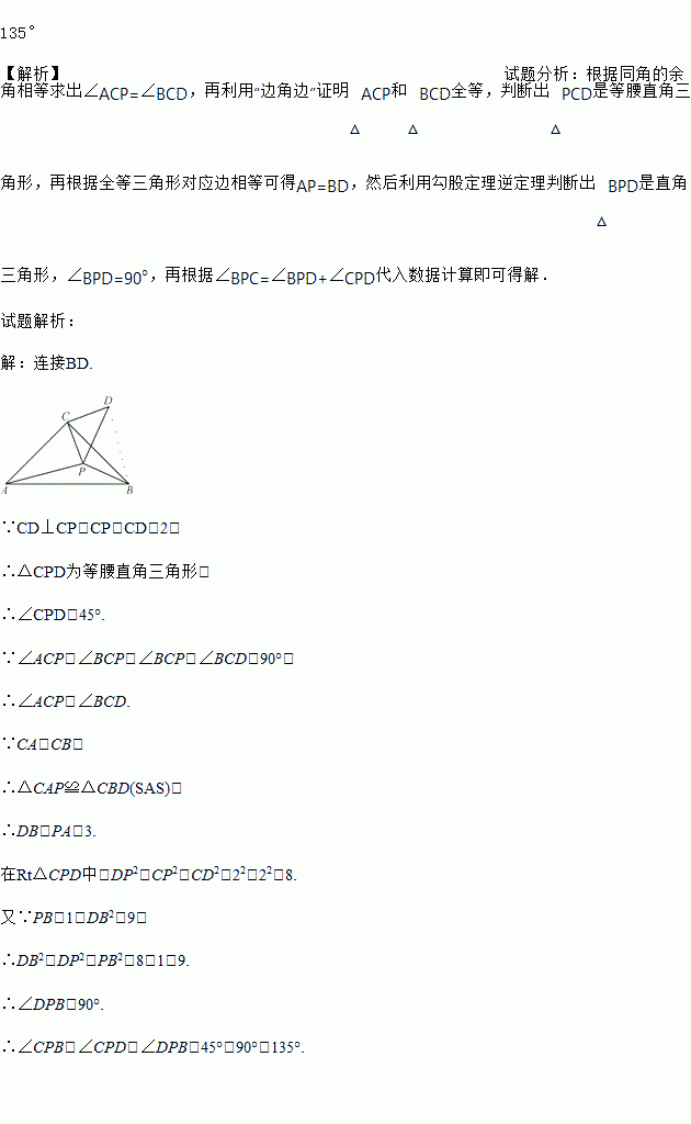 如图,在△ABC中,∠ACB=90°,AC=BC,P是△ABC内一点,且PA=3,PB=1,PC= CD=2,CD⊥CP,求∠BPC的度数