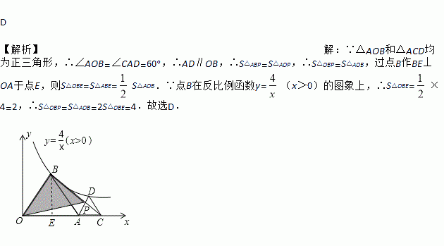如图,等边△AOB和等边△ACD的一边都在x轴的正半轴,顶点B、D均在双曲线y=(x>0)上,BC与AD相交于点P,则图中△BOP的面积为( )