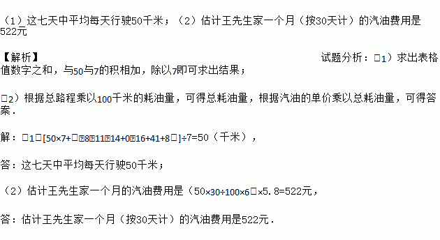 (1)这七天中平均每天行驶50千米;(2)估计王先生家一个月(按30天计)的汽油费用是522元 【解析】试题分析:(1)求出表格值数字之和,与50与7的积相加,除以7即可求出结果; (2)根据总路程乘以100千米的耗油量,可得总耗油量,根据汽油的单价乘以总耗油量,可得答案. 【解析】 (1)[50×7+(﹣8﹣11﹣14+0﹣16+41+8)]÷7=50(千米), 答:这...