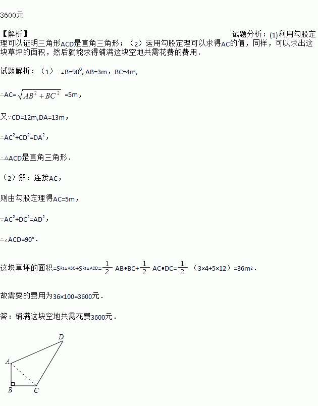 如图,某住宅小区在施工过程中留下了一块空地(图中的四边形ABCD),经测量,在四边形ABCD中,AB=3m,BC=4m,CD=12m,DA=13m,∠B=900.小区为美化环境,欲在空地上铺草坪,已知草坪每平方米100元,试问铺满这块空地共需花费多少元?