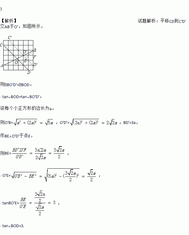 (2017•无锡)在如图的正方形方格纸中,每个小的四边形都是相同的正方形,A,B,C,D都在格点处,AB与CD相交于O,则tan∠BOD的值等于__________.