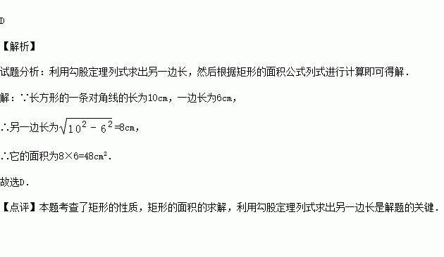 长方形的一条对角线的长为10cm,一边长为6cm,它的面积是( )