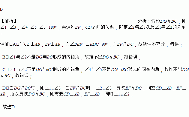 C. ∠1=∠2,∠4+∠5=180° D. CD⊥AB,EF⊥AB,∠1=∠2
