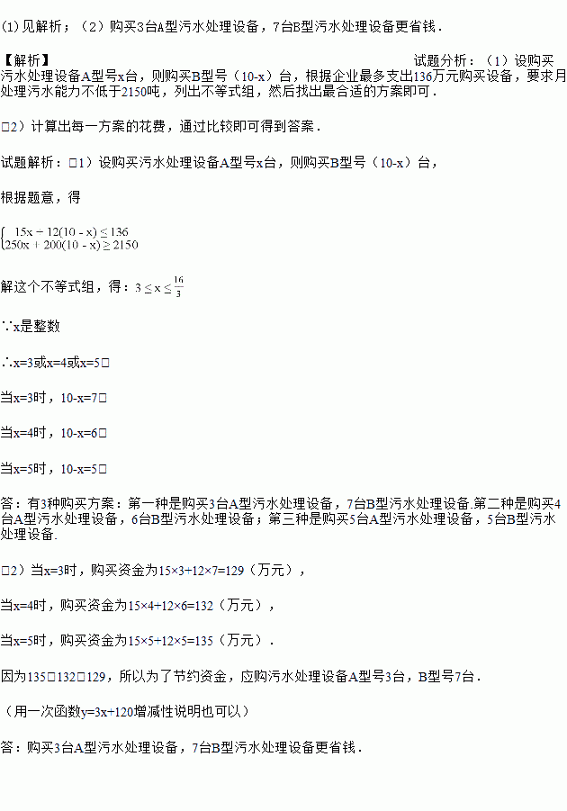 经预算,企业最多支出136万元购买设备,且要求月处理污水能力不低于2150吨.