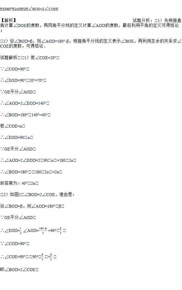 (1)若∠COE=20°,则∠BOD= ;若∠COE=α,则∠BOD= (用含α的代数式表示)
