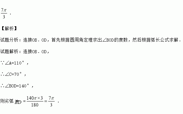如图,四边形ABCD是⊙O的内接四边形,若⊙O的半径为3cm,∠A=110°,则劣弧的长为 cm.