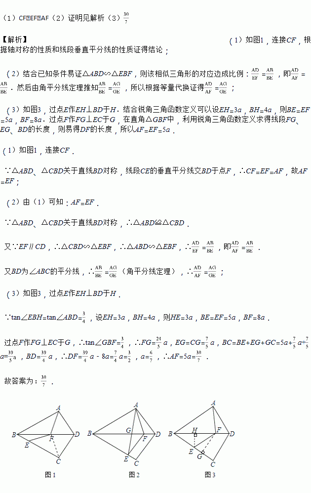 (3) 如图3,若∠BAD=90°,且点E在BF的垂直平分线上,tan∠ABD=