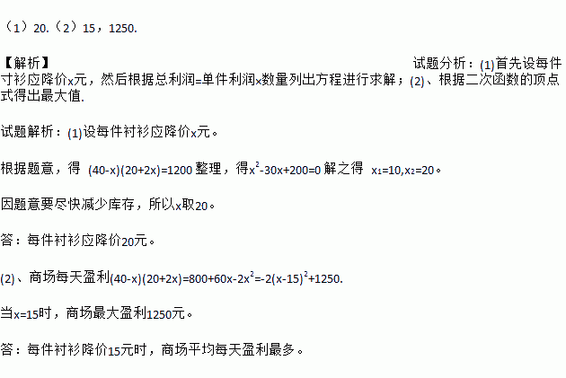 (1)20.(2)15,1250. 【解析】试题分析:(1)首先设每件寸衫应降价x元,然后根据总利润=单件利润×数量列出方程进行求解;(2)、根据二次函数的顶点式得出最大值. 试题解析:(1)设每件衬衫应降价x元。 根据题意,得 (40-x)(20+2x)=1200 整理,得x2-30x+200=0 解之得 x1=10,x2=20。 因题意要尽快减少库存,所以x取20。 ...