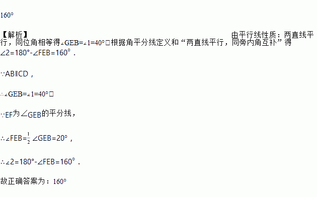 如图,已知直线AB∥CD,∠GEB 的平分线EF交CD于点F,∠1=40°,则∠2等于_____.