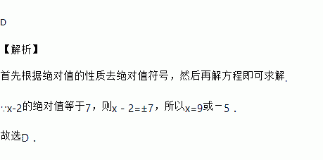 如果式子x-2的绝对值等于7,那么x的值为( )