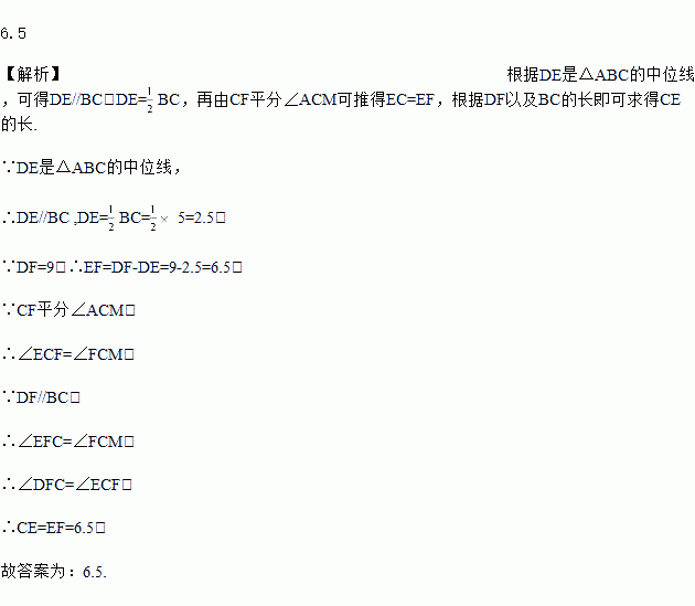 如图,在△ABC中,∠ABC=90°,BC=5.若DE是△ABC的中位线,延长DE交△ABC的外角∠ACM的平分线于点F,且DF=9,则CE的长为___.