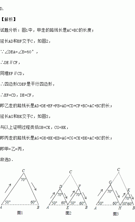 如图,图1、图2、图3分别表示甲、乙、丙三人由A地到B地的路线图(箭头表示行进的方向).其中E为AB的中点,AH>HB,判断三人行进路线长度的大小关系为( )![]()