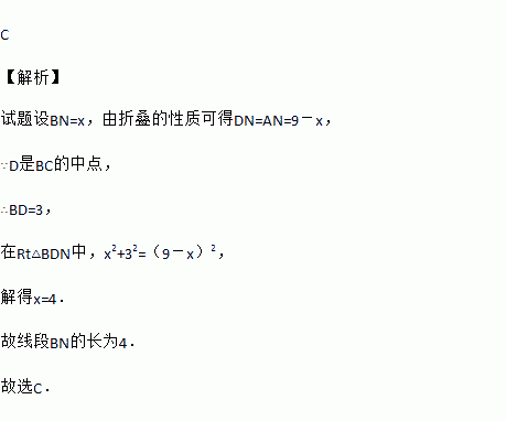 如图,RtΔABC中,AB=9,BC=6,∠B=90°,将ΔABC折叠,使A点与BC的中点D重合,折痕为MN,则线段BN的长为( )