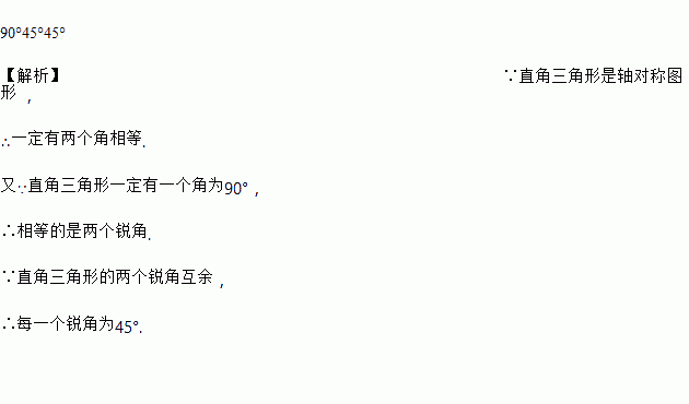 若直角三角形是轴对称图形,则其三个内角的度数分别为________.