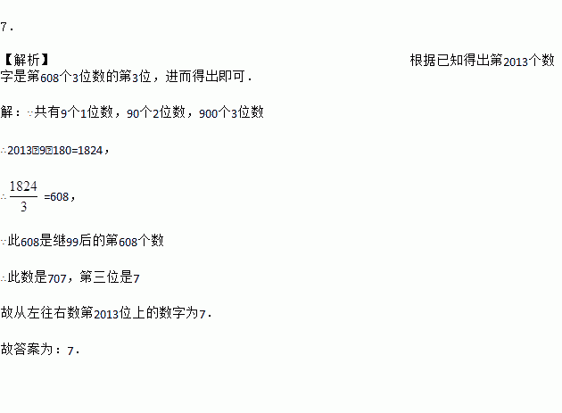 7. 【解析】根据已知得出第2013个数字是第608个3位数的第3位,进而得出即可. 【解析】 ∵共有9个1位数,90个2位数,900个3位数 ∴2013﹣9﹣180=1824, ∴=608, ∵此608是继99后的第608个数 ∴此数是707,第三位是7 故从左往右数第2013位上的数字为7. 故答案为:7.
