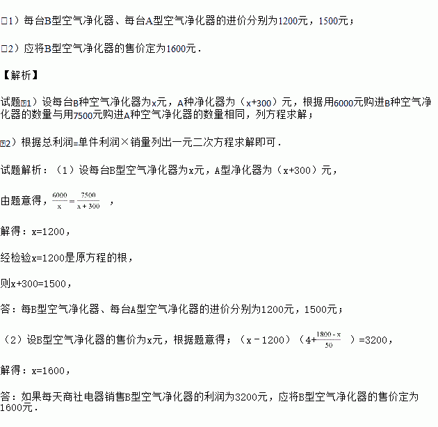 Ëæ×Ųñ¾²¼Í¼Ƭ¡¶ñ·¶¥Ö®Ï¡·µÄ²¥³ö£¬È«Éç»á¶Ô¿ÕÆøÎÛȾÎÊÌâÔ½À´Ô½ÖØÊÓ£¬¿ÕÆø¾»»¯Æ÷µÄÏúÁ¿Ò²´óÔö£¬ÉÌÉçµçÆ÷´Ó³§¼Ò¹º½øÁËA£¬BÁ½ÖÖÐÍºÅµÄ¿ÕÆø¾»»¯Æ÷£¬ÒÑ֪һ̨AÐÍ¿ÕÆø¾»»¯Æ÷µÄ½ø¼Û±Èһ̨BÐÍ¿ÕÆø¾»»¯Æ÷µÄ½ø¼Û¶à300Ôª£¬ÓÃ7500Ôª¹º½øAÐÍ¿ÕÆø¾»»¯Æ÷ºÍÓÃ6000Ôª¹º½øBÐÍ¿ÕÆø¾»»¯Æ÷µĄ̈ÊýÏàͬ£®