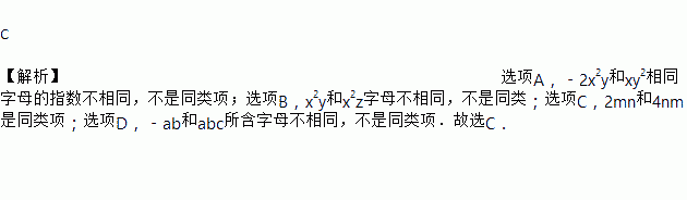 C 【解析】选项A,﹣2x2y和xy2相同字母的指数不相同,不是同类项;选项B,x2y和x2z字母不相同,不是同类;选项C,2mn和4nm是同类项;选项D,﹣ab和abc所含字母不相同,不是同类项.故选C.