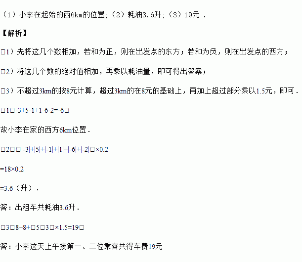 出租车司机小李某天上午营运时是在东西走向的大街上进行的,如果规定向东为正,向西为负,他这天上午所接六位乘客的行车里程(单位:km)如下:﹣3,+5,﹣1,+1,﹣6,﹣2,问: