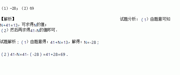 小明在计算41-N时,误将“-”看成“+”,结果得13,