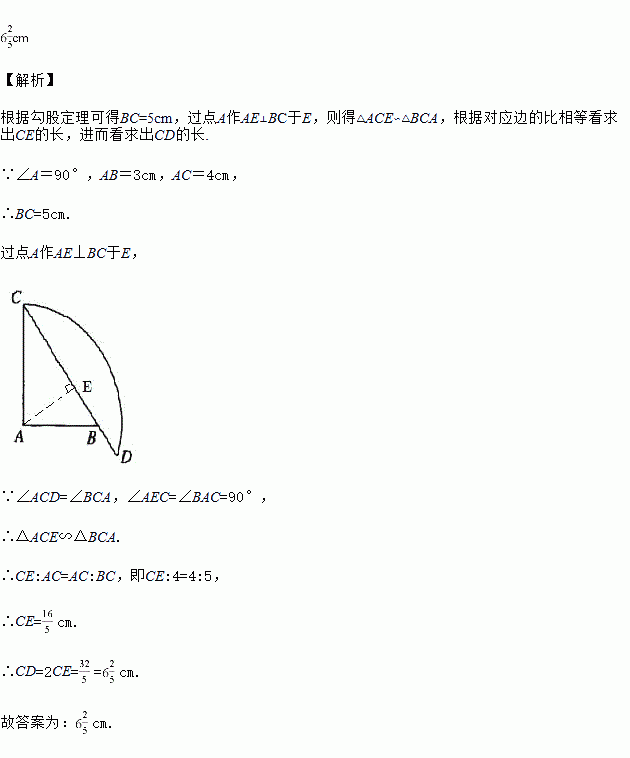 如图,已知在△ABC中,∠CAB=900 ,AB=3厘米,AC=4厘米,以点A为圆心、AC长为半径画弧交CB的延长线于点D. 则CD的长是 .