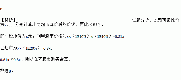 B 【解析】试题分析:此题可设原价为x元,分别计算出两超市降价后的价钱,再比较即可. 【解析】 设原价为x元,则甲超市价格为x×(1﹣10%)×(1﹣10%)=0.81x 乙超市为x×(1﹣20%)=0.8x, 0.81x>0.8x,所以在乙超市购买合算. 故选B.