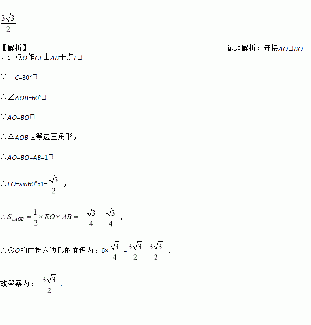 如图所示,△ABC为⊙O的内接三角形,AB=1,∠C=30°,则⊙O的内接六边形的面积为 _____